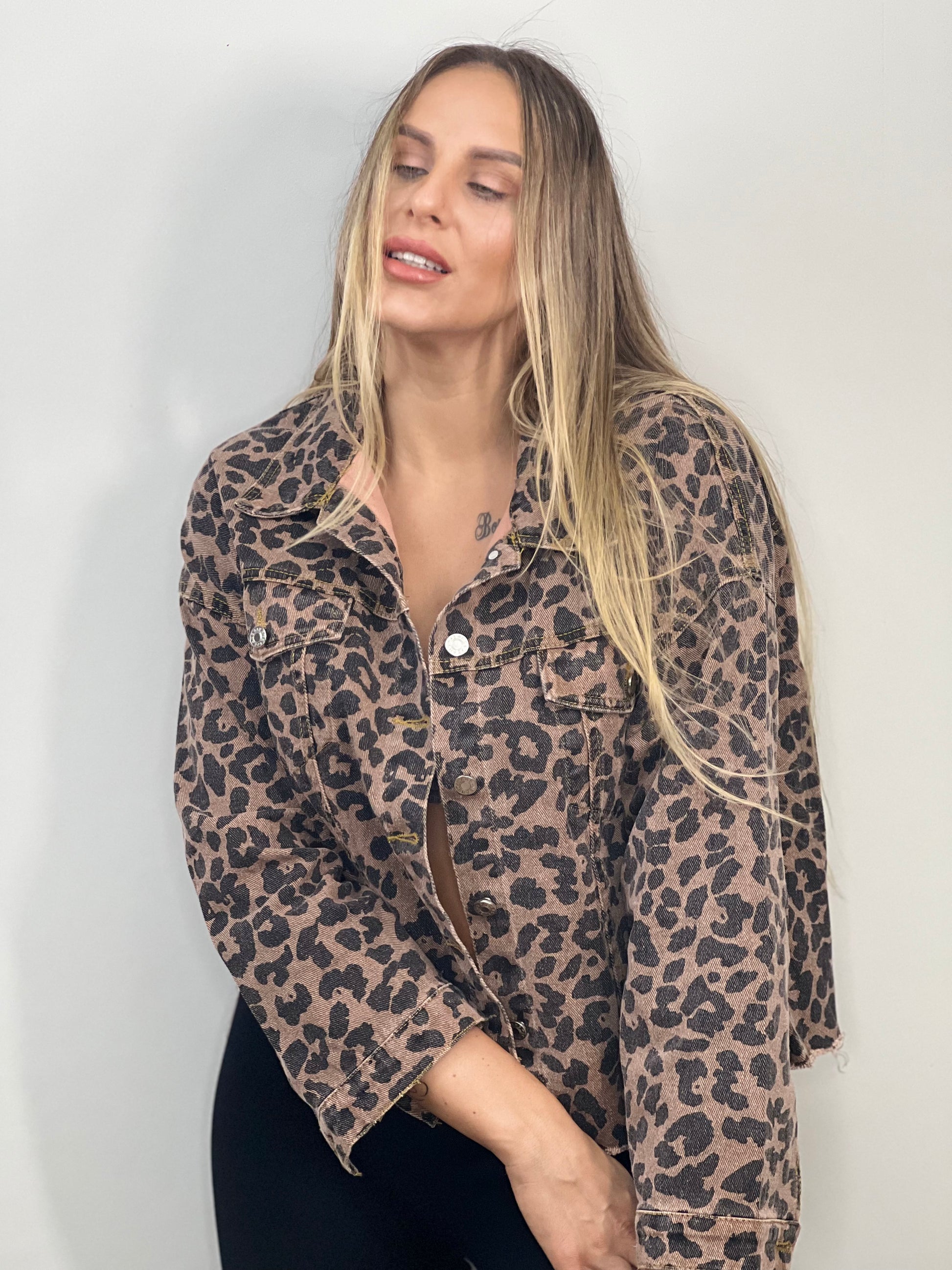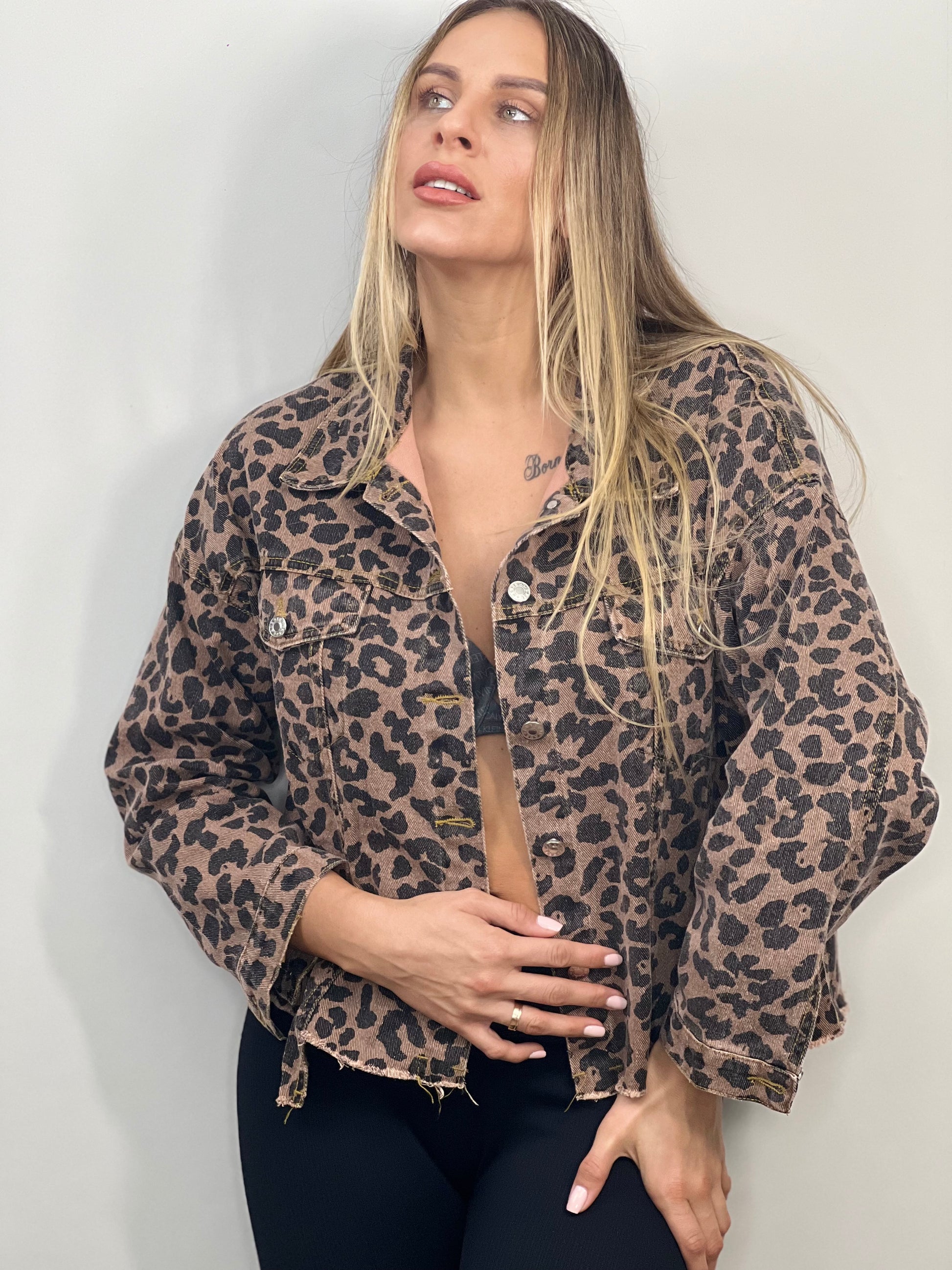 This denim jacket features a trendy leopard print design. Made from high-quality denim material, it provides both style and durability. The unique print adds a touch of boldness to any outfit. Enhance your wardrobe with this stylish and long-lasting denim jacket.