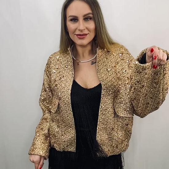 Introducing the Glittering Gold Bomber Jacket, crafted with quality materials and a striking design. This jacket shines with elegance and adds a touch of glamour to any outfit. Stand out from the crowd and elevate your style with our Glittering Gold Bomber Jacket.