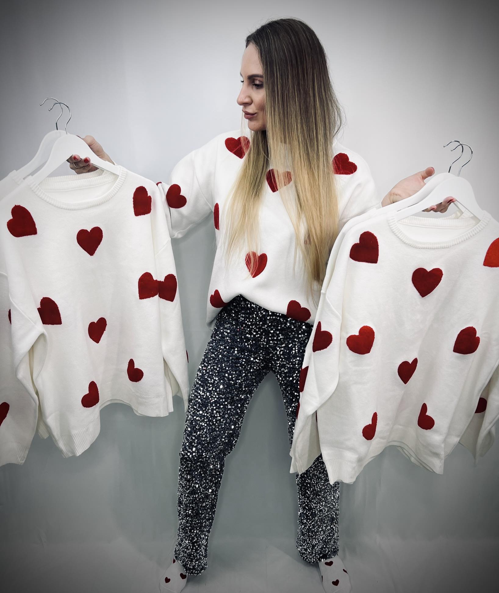 Expertly crafted, this red heart-adorned sweater is sure to make a bold and stylish statement. The oversize fit not only leaves you feeling cozy, but also adds a touch of modernity to your look. Perfect for any occasion, this white sweater exudes both charm and confidence.